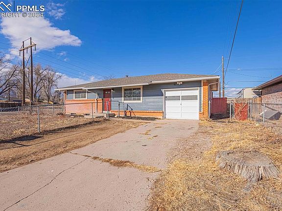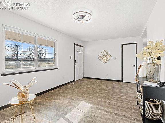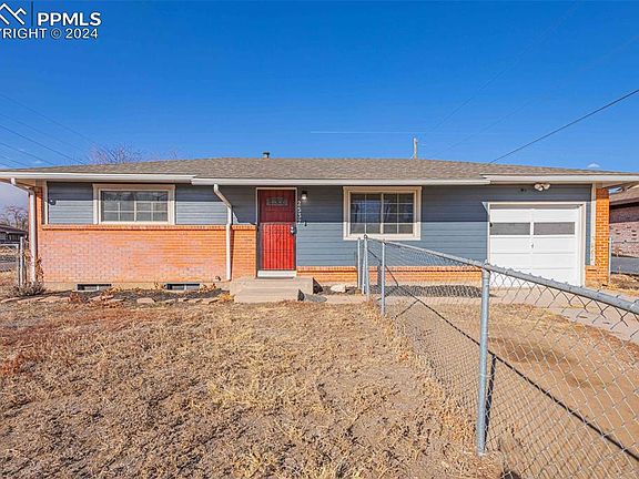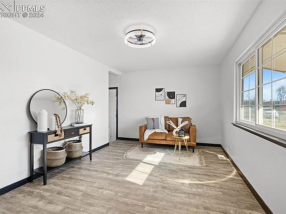 This inviting ranch style home is situated on a spacious corner lot, boasts 4 cozy bedrooms, 2 modern bathrooms, and a convenient 1-car attached garage. The house is fresh, clean, and ready for immediate occupancy. It offers an expansive open-plan living area, enhanced by elegant, Luxury Vinyl Plank (LVP) flooring throughout, and accented with stylish black trim, giving it a contemporary ambiance. Upon entering, you're welcomed into a bright living room bathed in natural light. The kitchen features all-new white paint, sleek new cabinets, a deep farmhouse-style sink, a chic subway tile backsplash, pristine new countertops, updated lighting, and comes fully equipped with kitchen appliances. The kitchen also includes a dining space with direct access to the garage, perfect for entertaining. The house includes three sizable bedrooms, each freshly painted and fitted with new plank flooring. The basement hosts a large utility room offering ample storage space, along with easy access to the brand-new water heater. Additionally, the basement contains a versatile, non-conforming bedroom with fresh paint and a substantial 6’ x 23’ walk-in closet. There's also a 3/4 bathroom in the basement, complete with a walk-in shower. The property's extensive corner lot is ideal for children and pets to play and enjoy. The backyard features a large dog run, a gardening area and two storage sheds. A double gate on the west side of the house provides convenient storage for recreational vehicles. The lot is surrounded by mature trees, offering privacy with no neighbors to the west or behind the property. This lovely home also has great views of the mountains, making it even more appealing. The house is ideally situated, just 6 minutes from Fort Carson and 5 minutes from I-25, surrounded by restaurants, shopping centers, and all essential amenities within easy reach.