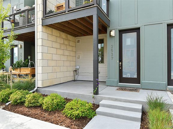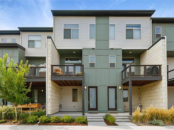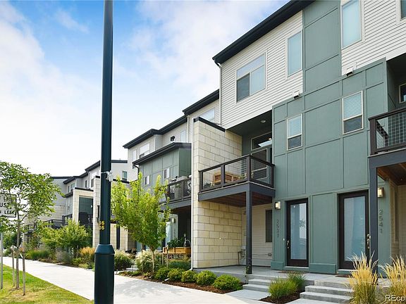 This chic townhome is the epitome of modern living. Built only two and a half years ago, it is practically new. As you approach the front porch, the first thing you will notice is the well-maintained exterior with neat landscaping and a covered porch. Inside, the front entry greets you with a light and bright feel, modern upgraded tile, and white railings that lead upstairs to the main living area. The open concept great room has space for living, dining, and entertaining. With floor to ceiling windows and extra tall ceilings, this home is flooded with light. Walk out the patio door and enjoy a cup of coffee or glass of wine on your Trex balcony. The beautiful Calimesa Graphite Oak Engineered Hardwood Floors  travel throughout the main living area, providing a nice flow into the stunning kitchen. With quartz countertops, marble tile backsplash, stainless steel appliances, including a gas stovetop, and white shaker style cabinets, this kitchen is truly the heart of the home. This level also has a convenient powder bathroom. Upstairs you will find two good sized bedrooms, the larger of which has a walk-in closet, and a stunning bathroom with upgraded tile and double sinks. The second bedroom provides a fantastic 180 degree mountain and city skyline view. This home is complete with an oversized attached garage, in-unit washer and dryer hookups, and  pre-wiring for solar. Located in Stapleton with all of the neighborhood amenities, and just blocks from The Stanley Market Place, enjoy walkability and easy access to public transportation, downtown, and the Anschutz medical campus. In one of the fastest growing neighborhoods in the Denver metro area, this home provides the perfect combination of private and urban living.