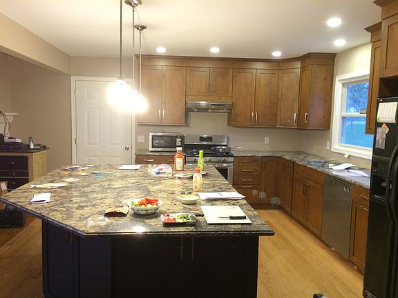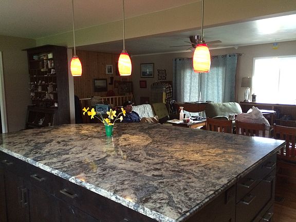 Here's a ranch with an incredible newer kitchen with stainless appliances and the biggest granite island you've ever seen. The hardwood floor and fireplace in the living room open up to that gorgeous kitchen making it the best conversation area possible. From the living room, you'll enjoy the fabulous view and you can pop out to the deck or into the quaint little sunroom. 4 Bedrooms, 3 full baths, one is brand new, and then the lower level has a nice family room again with a fireplace and even some nice built-ins. There's a 2 car garage and shed, deck with a view.