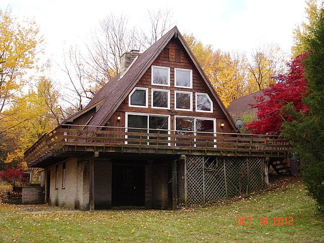 Two bedroom, 2 bath A-Frame home on 4.67 acres. Full basement, 2 car garage. Repairs needed. Sold "as is".