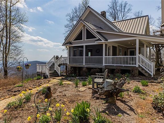 The world stops on the top of a mountain!! Sip your morning coffee and take in the Astonishing Views of your very own "Moving Art Masterpiece" as each new sunrise unfolds. Encompassing almost 60 acres and making its debut for the first time, this 3 level Custom Timber-Frame home is found tucked in a mountain side of the Pores Knob community in Moravian Falls. Waiting to greet you are gorgeous exposed beams, vaulted ceilings and larges windows that maximize natural light and showcase the long range panoramic views that span to the Charlotte Skyline. The floor to ceiling double-sided stone fireplace accents the living room space as well the primary bedroom and the large upstairs loft area. The eat in kitchen/dining area offers brick flooring, granite countertops and a working wood burning cookstove. The expansive deck and screened in porch provides great space for entertaining. Everywhere you turn this property offers tranquility that only the Mountains can bring.