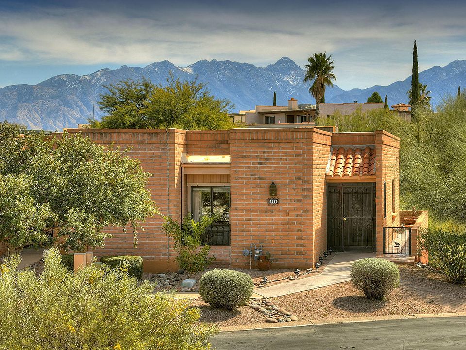 The perfect desert getaway! Gorgeous setting sitting high above the DH got club driving range and looking straight at the Santa Rita Mountains! This is a casita like no other! Corner lot at the end of the cul de sac adds extra windows and light. An enlarged living/dining area and double patio space offers lots of room for entertaining! The patio is covered and beautifully paved, with a gurgling water feature. You will surely spend most of your time here, entertaining or simply gazing at your incredible mountain view! The Arizona room is perfect an office, or simply xtra storage. A spacious laundry room allows an extra refrigerator, another clothes closet and more storage. The kitchen has been updated with sparkling granite counters, new cabinets, sink and tile backsplash. Both baths have tiled, walk-in showers and the 2nd bath has a beautiful new vanity. Earth-toned tile flows throughout giving a fresh, modern feel. This very special unit even has two parking spaces right out front. This home offers the perfect combination of low maintenance and spaciousness-all surrounded by those breath-taking views!