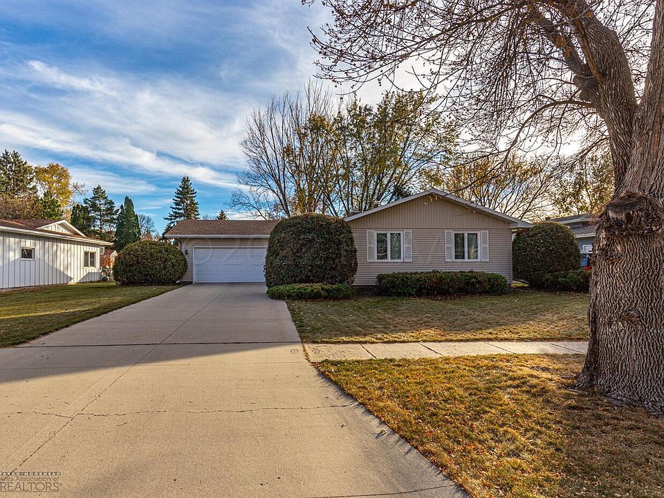 Charming rambler in established north Fargo neighborhood. Open kitchen and dining plan with built in's, large breakfast bar and brick wall accent. Large living room with gas fireplace, windows overlooking back yard. Master bedroom with private bathroom. 2 additional bedrooms and full bathroom complete the main level. Finished family room with fireplace, new ceiling & recessed lighting, office area and flex area. 4th bedroom potential with added egress, walk in closet. Huge fenced yard, so much potential! 2 stall attached garage. Updates: driveway (2012), roof (2015), flooring kitchen/dining (2018), fence/water heater (2019), gas hot water boiler inspected/cleaned (2022). Ductwork in place for GFA. NO SPECIALS.