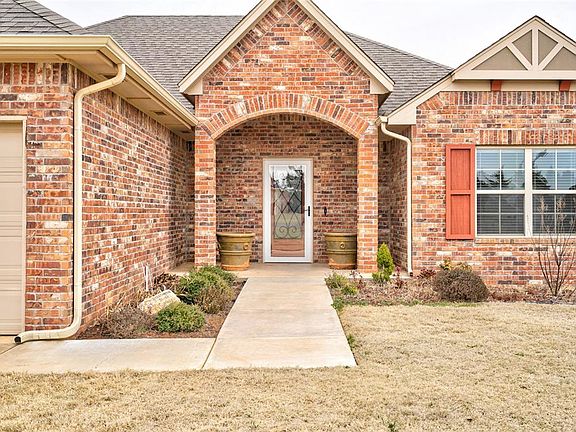 Located in a cul-de-sac this 4 bed, 2 bath split plan home in Cashion sits on a large 1-acre lot in the popular Verde Ridge neighborhood. There is a ton of space and it is only a few blocks from the school. The living room features vaulted ceilings, wood beams, large windows, and a fireplace. Spacious kitchen off the living room with a roomy casual dining area. Great flow for entertaining! The kitchen features tons of storage and lots of natural light with beautiful granite countertops. The spacious primary bedroom features bright windows, a large walk-in closet, coffered ceilings, and a private en-suite. The primary bath offers a walk-in shower, a soaking tub to relax after a stressful day, a sizeable double vanity, and a walk-in closet. Similarly sized guest beds 1, 2, and 3 share the full guest bath with great vanity space, and shower tub combo. Backyard features a lovely covered patio for enjoying your morning coffee. Backyard also has an in-ground storm shelter and plenty of room to add your own shop!