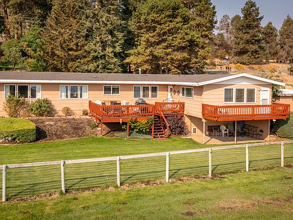 Rare Find! Lakefront acreage so close to town! All inspections done and available for review. Very nice ranch-style home with lake views on a total of 3.82 acres. Two tax lots so can either build a second residence or sell the lakefront lot off separately. Living room plus family room with vaulted ceiling. Maple cabinets in the kitchen and stainless steel appliances. 5 bedrooms, 3 full bathrooms, and wood parquet flooring. Great views from most rooms including the master bedroom. Nice deck for enjoying evening BBQ's. The acreage is in pasture, fenced, and with a two-stall horse barn.