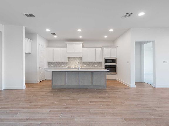 MOVE IN READY! Extended entry with 12-foot ceiling leads to open kitchen, dining area and family room with 10-foot ceilings throughout. Kitchen features walk-in pantry, 5-burner gas cooktop, generous counter space and inviting island with built-in seating space. Dining area features wall of windows. Family room features a wood mantel fireplace and wall of windows. Primary suite with 10-foot ceiling and wall of windows. Double doors lead to primary bath with dual vanities, garden tub, separate glass-enclosed shower and large walk-in closet with access to utility room. A guest suite with private bath adds to this one-story design. Covered backyard patio. Mud room off two-car garage.