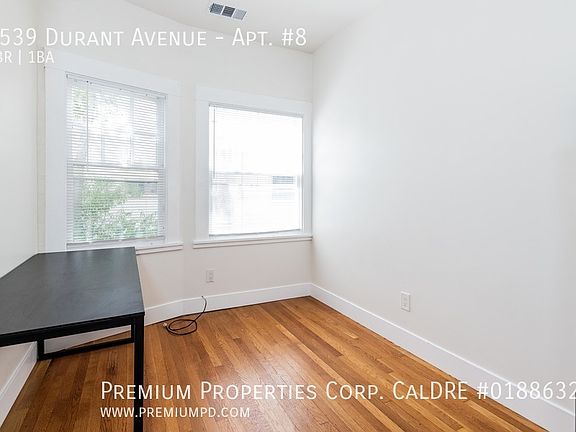 THIS WONDERFUL TWO BEDROOM FEATURES: Hardwood Floors & High Ceilings Spacious Floor Plan Only 1 Block Away From Campus Shared Laundry On-Site Ample Sunlight From Large Windows Water And Garbage Are Included Conscientious Resident Manager On-Site Free Membership To Premium Concierge Services Professionally Property Managed For Premium Service Applicants must qualify for a zero security deposit. Fees and Restrictions may apply. See Leasing Agent for Details. Durant CAL Apartments 2539 Durant Ave Berkeley, CA 94704 PROPERTY DESCRIPTION The Durant CAL Apartments is a 17-unit complex that offers studios as well as 1- and 2-bedroom apartments. This building is an architectural treasure with tremendous charm and character throughout. Units feature beautiful wood trim, wainscoting, stained glass, high ceilings, and Tiffany light fixtures. The units are beautiful, most of them having refinished hardwood floors and period details throughout. The charm continues with elegant bathrooms and remodeled kitchens. A laundry room is also on-site. THE PREMIUM DIFFERENCE This property is professionally managed for Premium Service! We treat you like a customer and you can expect a high level of service from a friendly staff who's primary goal is to make you happy. We resolve any maintenance issues quickly and efficiently. Our properties are well maintained inside and out. This property has access to a Conscientious On-Site Resident Manager to provide you with even more service. Why rent an ordinary property when you can live in a Premium Property? PREMIUM CONCIERGE SERVICES Get ready to live the hassle-free life at your new apartment, which comes with an awesome membership to Premium Concierge Services for your initial lease term and guess what, it's totally FREE! Here's what you get: Utility Setup & Billing Renter's Insurance Handyman Services Cleaning Services Package Handling Package Return Trash Valet Service Concierge Recommendations And More To Come! Just a heads up some restrictions apply, so check with our agent for all the details. Oh, and the photos you see might be from a similar unit, but trust us, they're all great! NEIGHBORHOOD INFORMATION The building features a fabulous location super close to Telegraph Avenue, the gateway to UC Berkeley and the center of U.C Berkeley campus culture. The area is perfect for those who want to live where the action is. There's easy access to everyday necessities with CVS Pharmacy, Whole Foods and the UC Berkeley Campus within walking distance. Just around the corner you'll run into Telegraph's trendy stores and street vendors. Just a little bit farther and you're right in the middle of the Elmwood/College shopping district. If you're looking to get out of town for a day trip, Downtown Berkeley BART is just a bike ride away.