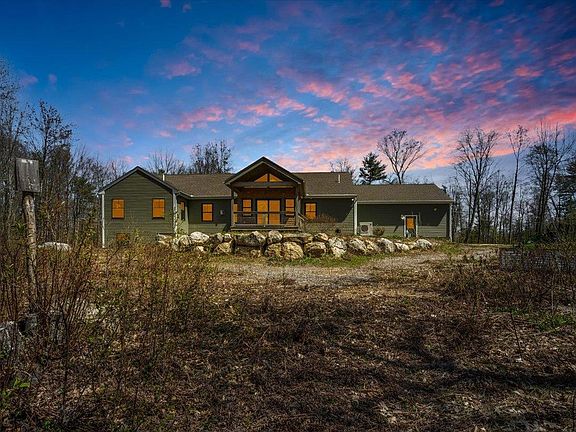 Tucked away on dirt road in Barrington, NH this home offers privacy, modern comfort, and a deep connection to the land. Surrounded by woods on all sides and set on over 10 acres, this thoughtfully built 2-bedroom, 2-bath ranch combines the ease of single-level living with timeless natural finishes. Built in 2019, this one-of-a-kind custom home features wide pine floors and walls that bring warmth and texture throughout. The kitchen is the heart of the home, designed for both function and connection, with 2 islands, one bar height to welcome guests, and one dining height for shared meals. A striking soapstone sink, counters & backsplash pair beautifully with butcher block surfaces, and a large walk-in pantry adds convenience. The living room features a gas fireplace framed in granite & French doors leading to a vaulted three-season room with views of the surrounding forest outside of every window. The spacious primary suite offers a tiled walk-in shower, soaking tub, radiant floor heat & 2 separate vanities. The guest bedroom also connects to a full bath with a walk-in shower, vanity, and utility sink. With a 2,000 sqft basement with daylight windows, and a 3 bedroom septic giving you room to expand! First-floor laundry, and 40-foot farmer’s porch, this modern turn-key property feels like HOME. With high speed internet making it remote-work ready, and perfectly positioned just 25 minutes to Dover or Durham with easy access to Portsmouth and Boston!