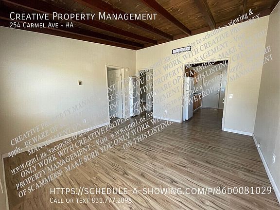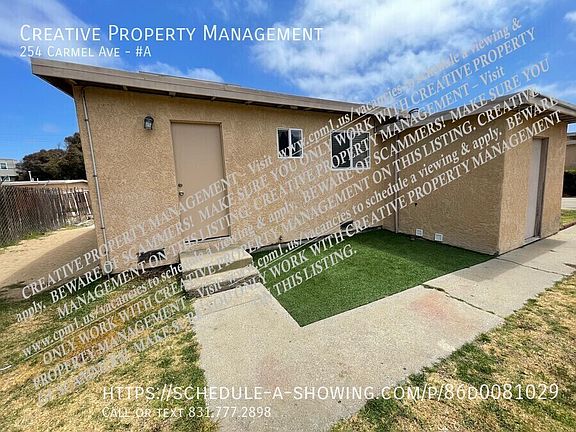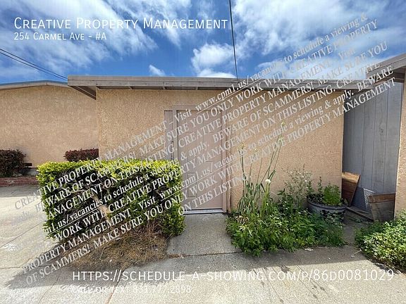 Schedule an appointment between 8:00am and 6:30pm daily. Nestled in the heart of Marina, this inviting residence at 254 Carmel Ave, Unit A, offers the perfect blend of modern comfort and coastal convenience. Just minutes from the sandy shores of Marina State Beach and the vibrant downtown, this home is an ideal retreat for those seeking a serene yet connected lifestyle. Step inside to find a bright and airy living space, featuring an open-concept layout with updated finishes and ample natural light. The well-appointed kitchen boasts sleek appliances, perfect for culinary enthusiasts, while the cozy bedrooms provide a peaceful haven for rest and relaxation. With its prime location near Highway 1, enjoy easy access to Monterey, Carmel-by-the-Sea, and the scenic wonders of the Monterey Peninsula. Outside, the community offers a family-friendly atmosphere with nearby parks, shopping, and dining options, plus proximity to Cal State Monterey Bay for students or faculty. Whether you're a first-time buyer, downsizing, or seeking a coastal getaway, 254 Carmel Ave, Unit A, is your gateway to the best of Marina living. Don't miss this opportunity to own a slice of California's stunning coastline! Schedule a tour today and experience the charm of 254 Carmel Ave, Unit A, for yourself. Deposit $2,145 No Pets, No Cats, No Dogs No Co-signer's No Smoking