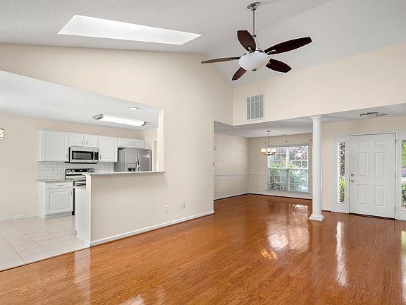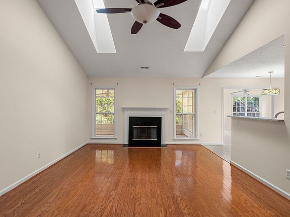 Great home with features that set it apart from the rest, including built-in cabinetry, skylights, an enclosed sunroom, screened porch, and fully fenced yard. Fresh paint throughout! Lawn mowing included! Lovely hardwood floors are throughout the living room and formal dining room. The living room features a gas fireplace and soaring cathedral ceilings with skylights. The open kitchen has an eat-in dining area, granite counters, and appliances including the smooth-top electric range, refrigerator, dishwasher, and microwave. The rear of the home offers wonderful additional living space for all seasons in the sunroom, screened porch, and fully fenced backyard. Tile floors are throughout the kitchen, eat-in dining area, sunroom, bathrooms, and laundry. The laundry room is located between the kitchen and attached two-car garage, and the full-size stacked washer and dryer are included. The spacious primary bedroom suite has vaulted ceilings and a walk-in closet. Its en suite bathroom has tile floors, a dual-sink vanity, garden tub, and the separate glass-enclosed shower. The front bedroom is set up perfectly for use as an office and guest room, as it includes built-in cabinetry including a desk and a Murphy bed! The third bedroom is at the rear of the home, looking onto the screened porch and backyard. All bedrooms are carpeted. The full hall bathroom includes a bathtub/shower. Central heat (natural gas) and central air conditioning (electric). Ceiling fans throughout. Tenant responsible for all utilities, including electricity, water, and natural gas (for the furnace, fireplace, and hot water heater). Trash is provided by the Town of Fletcher. Lawn care provided by the HOA; tenant responsible for landscape maintenance, including pruning and weeding beds. No smoking. No cosigners. No pets.