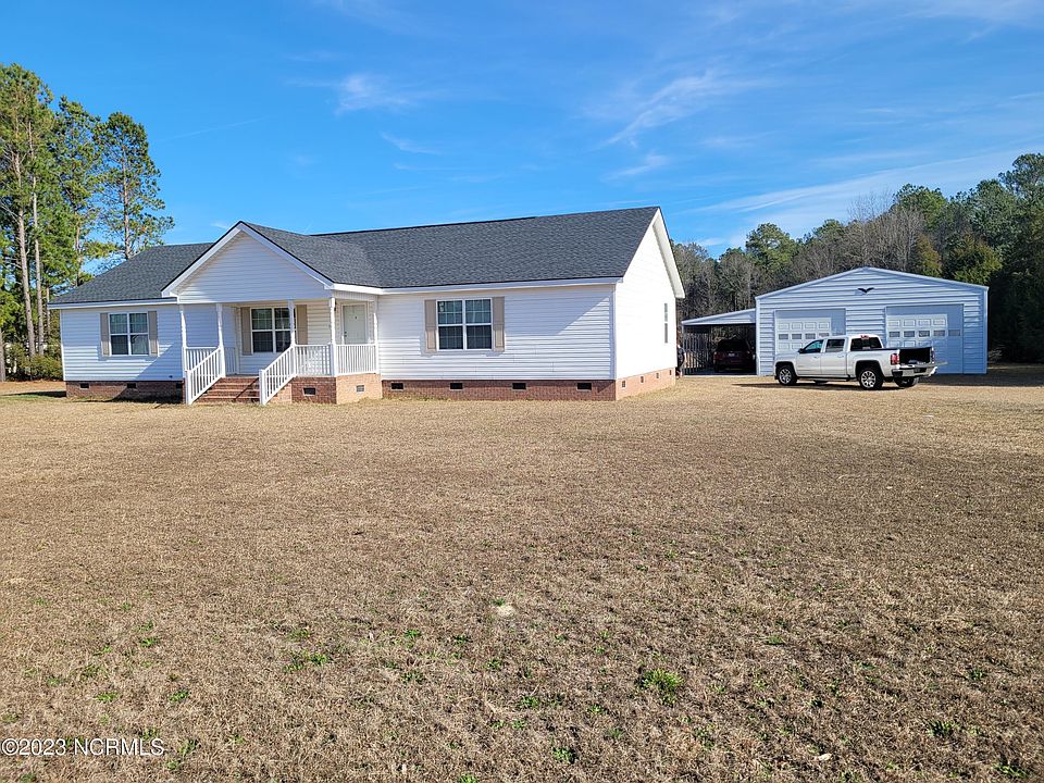 2.3 cleared acres with 3 bed, two bath beautiful modular home, front and rear covered porches w 30' x 40' garage and 12' x 40' carport. Modular home is 12 years old with no HOA! Master bath features a walk-in bath and separate shower. Come see it!