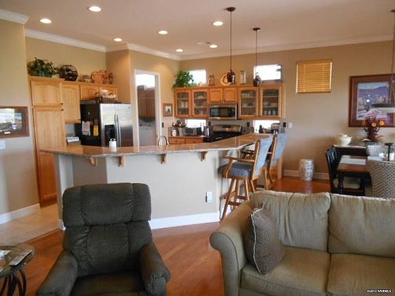 You'll look far and wide to find a home with the pride of ownership found in this upgraded home on the Dayton Valley Golf Course! This home features 2 bedrooms, 2 baths, a den with French entry doors, a great room concept with hardwood flooring, a gas fireplace, a kitchen with beautiful granite counter tops, stainless steel appliance, a breakfast bar and breakfast nook. Several of the kitchen cabinets are glass fronted and there is crown moulding throughout the home. Designer paint touches and a beautiful