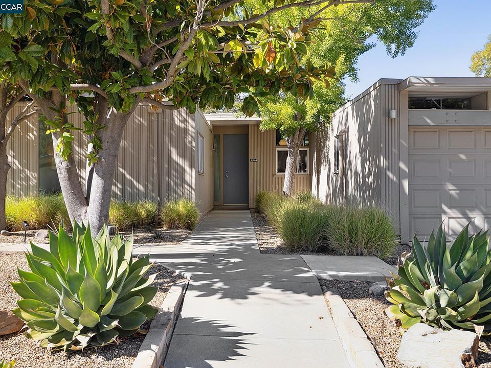 Experience the best of California living in this beautiful Eichler, a true Palm Springs escape in Walnut Creek. This home combines mid-century charm with modern comforts. Higher ceilings greet you as you enter into the kitchen and living room, creating an airy and spacious feel. Living room provides views of private backyard paradise, allowing natural light from the floor to ceiling windows. Cozy up by the fireplace on cooler days. The kitchen has stainless steel appliances as well as a gas cooktop range and breakfast bar. Step into your private oasis-like backyard, with a sparkling pool, complete with solar heating. Spend evenings around the fire pit with built in concrete and wood benches. Planters are ready for your veggie garden, complemented by vibrant succulents, a fruitful fig tree, and fountain. Wood paneling in primary suite creates a warm and inviting space. The updated bath boasts double sinks, Caesarstone countertop, a sleek Kerf vanity, Heath tiles, custom closets. Additional highlights include concrete floors, recently installed HVAC (7/23), EV charger, updated electrical, double paned windows and sliders throughout- what every Eichler owner dreams of. Located close to Heather Farm Park, top rated schools, downtown Walnut Creek, shopping, trails, and so much more!