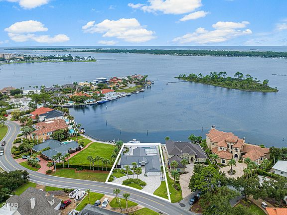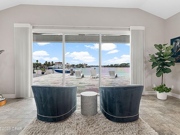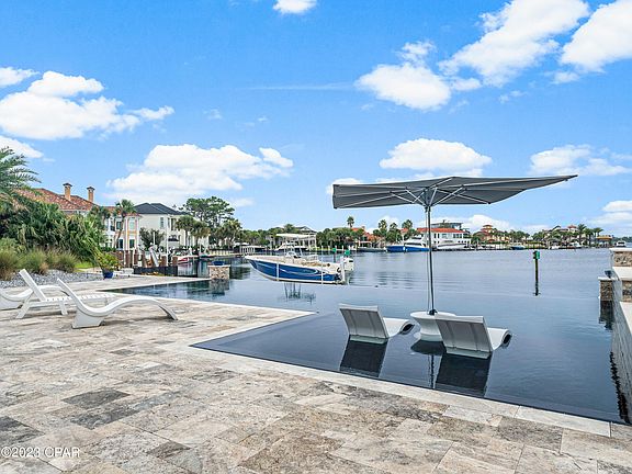 This exceptional Bay Point retreat is a boater's paradise, located on the shores of the scenic Grand Lagoon with convenient canal access to a host of water-based adventures. A sweeping circular driveway provides ample parking along with a two-car attached garage. More impressive still, the backyard greets you with views of an inviting infinity edge pool. The outdoor oasis continues with a hot tub, gas fire pit and covered travertine patio. At the water's edge, you'll discover your own private deep-water dock, offering convenient access less than a mile away from the pass. This exclusive feature includes through-flow decking and a hydraulic boat lift for your enjoyment. Step inside to find this spacious ranch home that has been completely renovated from sleek travertine floors to an aluminum seamless roof. A synergy of open living spaces provides enviable areas designed for laid-back living, relaxing and entertaining. The open living room and dream kitchen deliver breathtaking views of the open bay and pool. Laid out for living all on one level, this beautifully presented home also has three beds and three modern baths. As well as delivering superb boating activities, this prestigious gated community has an enviable championship golf course to challenge and delight. The newly opened Point South Marina offers sheltered slips with easy access to the Gulf of Mexico and Intracoastal Waterway. It's the perfect base for endless days spent fishing, boating and enjoying the open water.