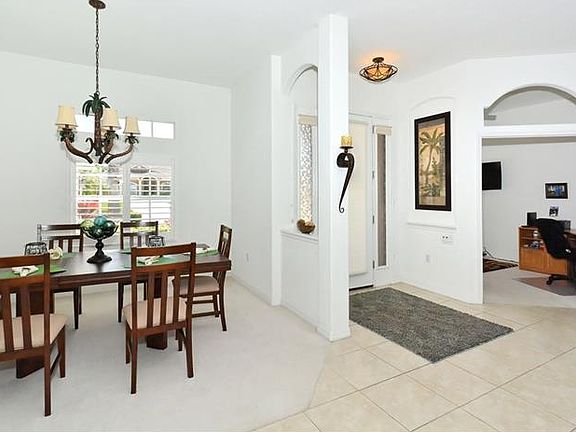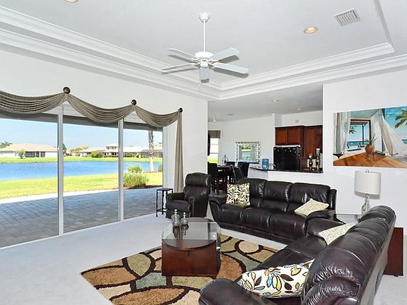 Relax in the evening and watch the sunset. This lake front home has absolutely gorgeous views from your master bedroom, great room, kitchen and separate eating area. When you first arrive you will notice the beautiful mature landscaping with outdoor designer lighting, 3 car side load garage with extra side parking. True split floor plan with private owner''s suite and bath on one side with 2 additional bedrooms and full bath on the other side of this home. Open kitchen design with new refrigerator, granite counter tops, upscale cabinets, along with a separate formal dining room and den complete the interior layout of this home. Additional features include: new high end washer and dryer, new interior light fixtures and beautiful plantation shutters. CDD is included in tax bill total. You surely will not be disappointed with all that this community and immaculate home have to offer. Please Note: Palm tree chandelier does NOT convey.