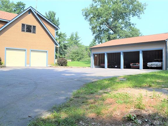 Car Enthusiasts and Horse lovers delight with this multi functional property with TWO LARGE GARAGES. One, 4 door garage, deep enough to fit 8 cars with approx. 20+ foot ceiling height and stalls on the back for horses, tractor storage or whatever you want. 2nd garage is attached to house with 2 bays, approx 20+ ceiling height. Property Zoned agricultural.House is over sized cape on almost 5 acres in a very private country setting. 3 Beds, 3 full baths, 2 bonus rooms, laundry room, dining room, office, reading nook, family entertainment area. Full kitchen, sliding glass doors, Hurd windows, in ground pool. Seller is willing to give credit for flooring/carpet on second level.