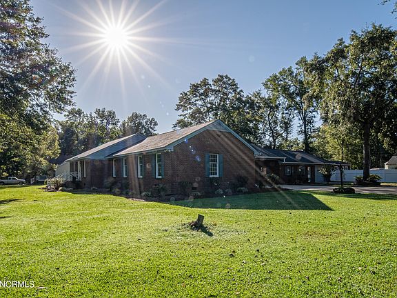 Charming corner lot ranch home boasts recent upgrades including a new roof, gutters, heat pumps, water heater, fresh paint, and new carpet/vinyl flooring. This spacious, well-built home offers abundant storage, low maintenance, and cost-efficient utilities. Inside, find three large bedrooms and 2.5 baths on one side of the double carport, while a generous 1180 sq ft recreation room with a kitchen, gathering space, bathroom, and spare room awaits on the other side. The primary bedroom offers a large safe in the closet that conveys. Additional perks include a circle driveway, extra parking, two enclosed storage buildings (18x20 & 20x20), and large deck. This home currently operates on a well and septic system, with the option to connect to city utilities. Located in a quiet neighborhood just off the bypass, it's a quick 15-minute drive to Greenville's ECU Health and East Carolina University. This home is a must-see!