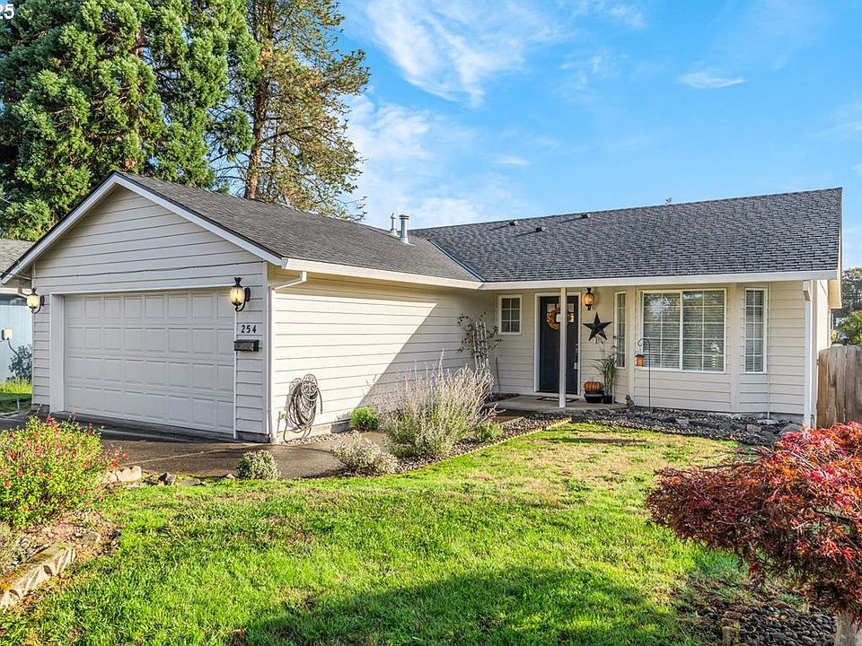 Discover this beautifully updated, single-level ranch style home offering 1,056 square feet of comfortable living space. This 3 bedroom, 2 bath home features luxury vinyl wood floors throughout and a bright, open living room with a bay window and vaulted ceiling. The dining room includes a slider leading to the deck and fully fenced backyard complete with fruit trees and raised garden beds. The kitchen offers a convenient cupboard pantry, an eating bar and window overlooking the backyard. You'll also appreciate the inside utility room with washer and dryer included. Additional updates are new roof in 2020, HVAC system with central air conditioning in 2021, ensuring comfort and peace of mind year round. Primary bathroom has a brand new vanity and toilet. The two car garage provides plenty of storage and parking space. This move-in ready home blends comfort, charm and modern updates. It is ready for you to make it your own.