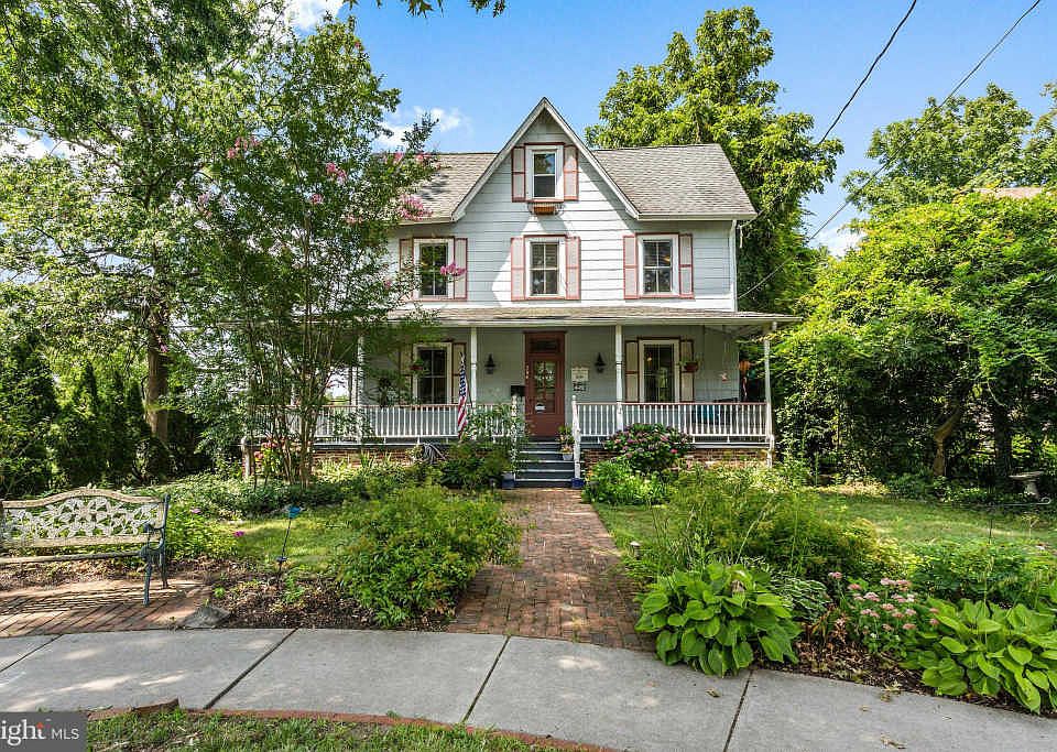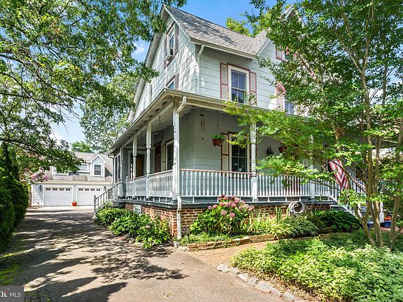 A Charming Victorian Home in the center of Moorestown, just steps to downtown Main Street. This home offers 4-5 bedrooms, 2.5 bathrooms, a wrap-around porch and a newer detached garage complete with additional living space above! Stepping into the front door you will see beautiful hardwood flooring and crown moldings throughout with fresh neutral paint in many of the rooms. Upstairs, the main suite has vaulted cathedral ceilings, skylights and a library loft balcony overlooking below. Completing upstairs, are 3 additional bedrooms as well with lots of storage and hardwood flooring throughout. Stepping into the backyard is a nice deck and gardeners dream which overlooks a private, fully fenced yard with mature trees, garden veggies, and a brick patio with rose garden and brick paths. Additionally, there is a shed with wood frame, windows, French doors, concrete flooring and drop down stairs for added storage. A newer 2-car detached garage is the perfect addition for this home which offers additional living space above. The added square footage is heated, has skylights, ceiling fans - currently set up like an apartment. There is also additional storage/closet space and an intercom system which connects back to the main house. This bonus space can be used for an office, another bedroom, playroom or extra space for visiting guests. Make your appointment to see this stunning historic home in the perfect town center location today! Seller is providing a 1 year Home Warranty for new buyer