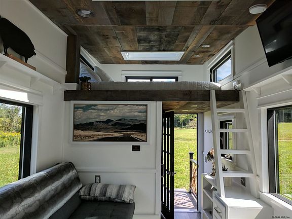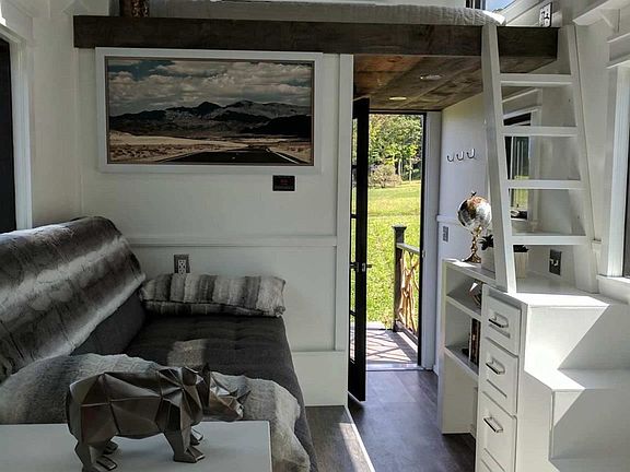 One of the hottest trends in the US. Ideal camp, home or retreat. The Arcadia is a luxury tiny home for the nature lover. A signature model, this tiny house feels as big as a regular home, modern shape, handcrafted rustic details and features large windows on all sides to provide an excellent view of wherever you decide to build it. The exterior is pine shiplap, woodburned using the Japanese technique, Shou Sugi Ban The porch, with a river branch railing, opens into the entryway, with coat hooks, shelves, and drawers. The sofa slides out on rails to convert into a full-size guest bed, allowing the house to sleep four Built-in storage is tucked away throughout, including a bookcase, drawers and cabinets, and shelving. This is an example of a to be built. More plans available