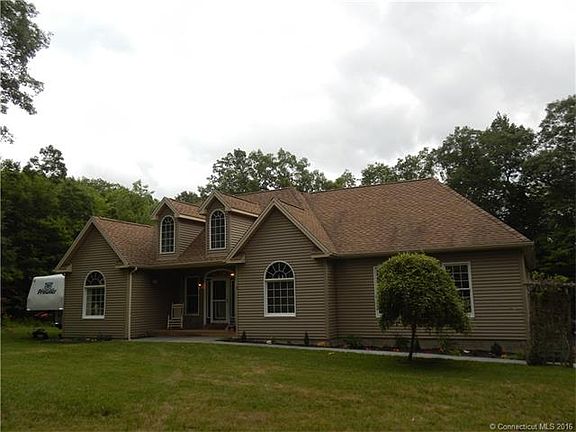 Come home everyday to your own wonderland. Drive up the long private driveway and enter your homeland with open floor plan, majestic field stone fireplace, pristine hardwood floors, master suite with private slider to deck overlooking your 8 acres of private paradise yet a perfect commute to either Hartford, Springfield, or Boston, close to I-84 yet far enough away for quiet evenings away from it all. This home features hardwood floors throughout, atrium windows, ample storage, two car garage and many out buildings. If you want to raise chickens or peacocks, the out buildings are already there to enjoy! The detached Screen house is a must see and sit in! Awesome room for three seasons with electricity to enjoy evenings bug free! Patio with fire pit and large deck. This is a must see home!