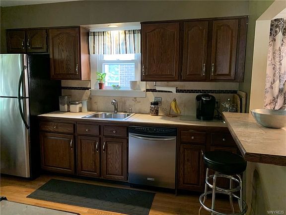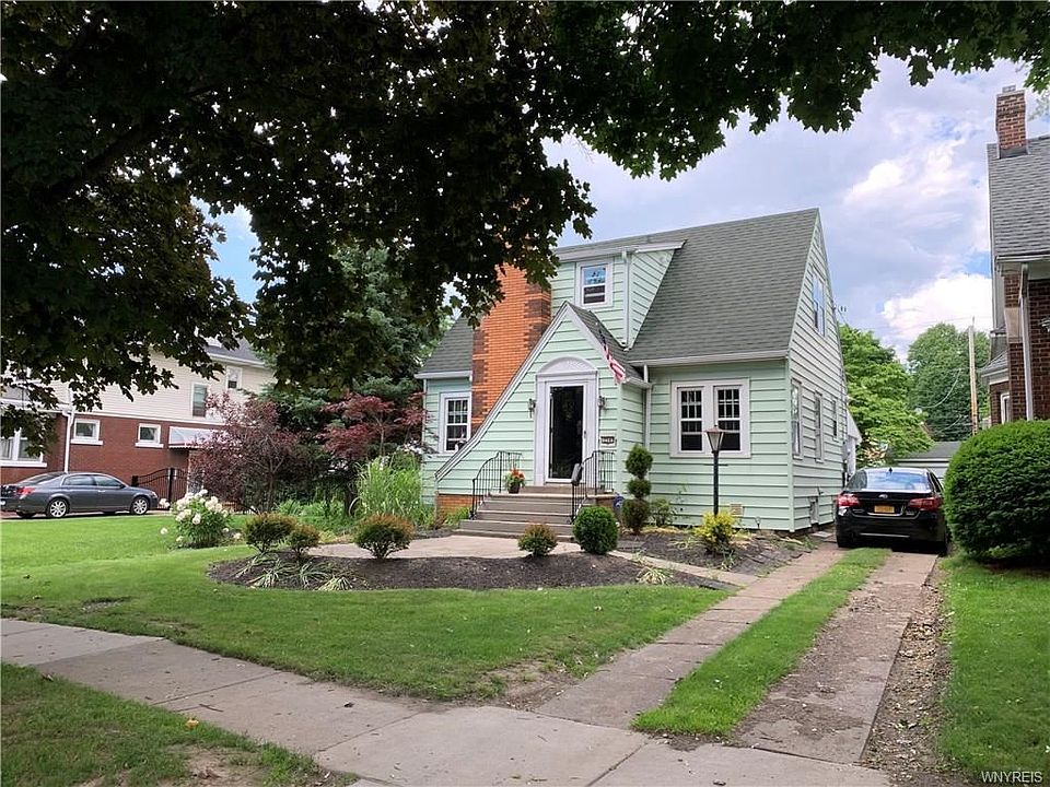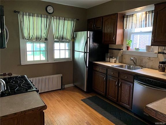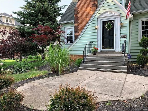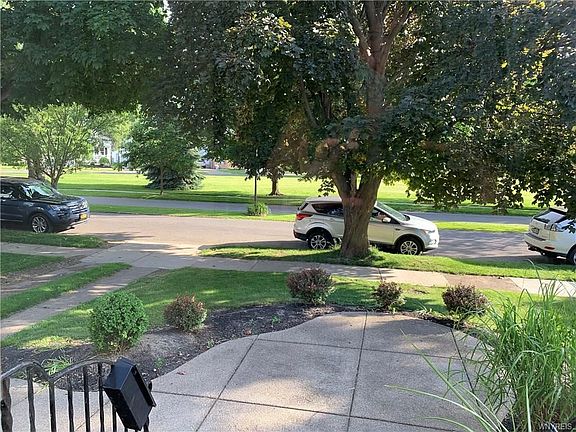 Charming South Buffalo home with natural woodwork and hardwood floors! View of park from your front door! Front and rear patios! The rear is a covered patio with metal roof overlooking the deep yard and detached garage! Interior has formal dining and living room has a wood burning fireplace and a beautiful tray ceiling! Includes all window treatments! Kitchen features stainless appliances and breakfast bar. 2 window AC units also included. Roof was a tear off in 2008, Boiler replaced in 2014, some windows replaced and glass block windows were also installed in basement.