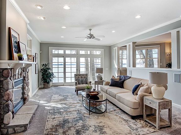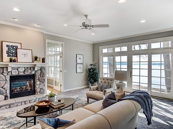 This prime Clear Lake home, with 127 feet of level, firm, sandy beach frontage, offers spectacular water views from every room. The beautiful open, light, and bright kitchen, ideal for entertaining, has just been refreshed, and includes new Cambria premium quartz counters, stainless sink and fixtures, new stainless appliances, sleek white custom Crystal cabinetry, center island, large breakfast bar, double pull out pantries, window seat, and glass door display cabinets. First floor ½ bath has new Cambria quartz countertop, sink, and stainless fixtures. The large first floor laundry has new top of the line HE washer/dryer, utility sink, generous cabinets, and hanging bar. The first floor also has fresh interior paint in rich neutrals. Every aspect of this home is thoughtfully designed to accommodate the entire family, while offering both family and guests quiet spaces and privacy. The lakefront screened porch is ideal for enjoying morning coffee or a Clear Lake sunset. A bright and airy first floor den/office includes a striking bay window and double French glass doors. The cozy sunroom features a beautiful 2-way stone gas fireplace, leading into a spacious great room, open to both dining room and kitchen. Beautiful interior and exterior transom windows add light and sparkle to the main floor, which has hardwood floors and all new carpet. The second floor is uniquely designed as three full suites, each with a large full bath, walk-in closets, and all new wood flooring. The master suite features a window wall facing the lake with walk-out balcony, and walk-in closet. There is new porcelain tile in the master bath floor and tub surround, large double vanity, separate shower, and jetted tub. The home boasts many premium features, including Marvin Ultimate Series windows throughout, Closet Tamers in all closets and storage areas, Beam central vac, Versa-Lift dumb waiter system to the walk-in garage attic, Hardi-Plank siding, stone wainscot, bonus upstairs laundry hook-up, custom beadboard, and much more. The garage, driveway and adjacent grassy area combine to provide six parking spaces. The included 150' x 4' Hewitt Roll-A-Dock with 16' x 8' deck is waiting for your boats. This area of the lake is very quiet and an amazing place for walking and enjoying nature. Make this your new lakefront home today!