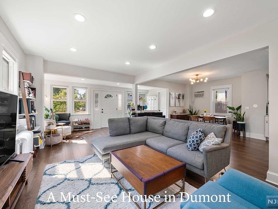The interior of this Dumont home has been fully renovated, featuring an inviting open floor plan. As you step inside, you'll be greeted by a bright and airy layout, perfect for modern living. The newly renovated eat-in kitchen boasts wood cabinetry, quartz countertops, a custom tile backsplash, and SS Samsung appliances. Wide plank wood laminate floors flow throughout the home, adding warmth and style. The living room, with recessed lightings, custom moldings and built-ins, provides a comfortable space for family gatherings and entertaining. A chic powder room completes the main level. Upstairs, you'll find a primary bedroom, a second bedroom, and a fully renovated bathroom. The finished basement offers additional space for a home office, playroom, or storage. The detached oversized one-car garage with a shared driveway offers convenience. Located within walking distance of NYC transportation, this home is must-see!