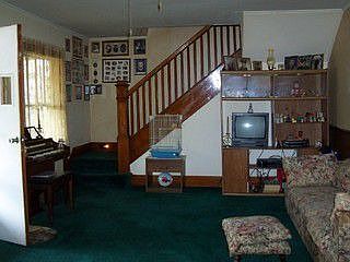 First floor has a front porch, updated family room. Laundry/bath with step in shower and newer floor. Kitchen/dining with wooden cabinets. Living room with front door access. Second floor has closet in hallway. Bedroom #1 has walk-in closet. Bedroom #2 has walk-in closet Bedroom #3 has a closet. Full bath. Covered back porch. Trip wire at end of driveway turns red light to green.