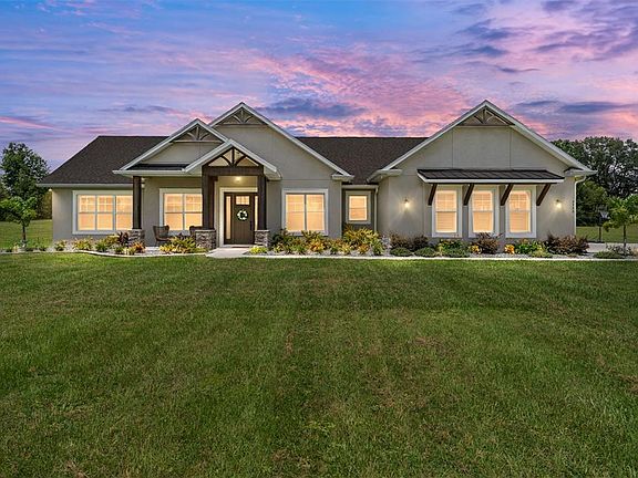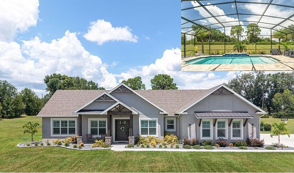 EXPERIENCE LUXURY LIVING in this EXQUISITE, CUSTOM BUILT, ESTATE POOL HOME nestled on 3.86 fenced acres in the EXCLUSIVE gated community of Sumter Crossing! Designed with exceptional craftsmanship and attention to detail, this magnificent property offers privacy, space, and a serene setting perfect for refined living. Stately wood pillars frame the inviting front entrance of this craftsman-style home showcasing metal, wood, and stone exterior accents. A quaint front porch and generous foyer welcome you in to the bright open floor plan that effortlessly connects the kitchen, dining, and living spaces, making it ideal for both everyday living and entertaining. Soaring 11-foot ceilings accented by custom wood beams add to the grandeur of this exquisite space. Whether you're hosting gatherings or enjoying a quiet evening at home, this open-concept design offers the perfect blend of functionality and freedom. For added convenience a home office with built-in closet is located just off of the foyer. The stunning custom kitchen is the heart of the home, combining high-end finishes with thoughtful functionality. Crisp white cabinetry paired with sleek quartz countertops, creates a clean, timeless look. The spacious center island, complete with a built-in sink, offers additional prep space and seating-perfect for casual meals. Cooking enthusiasts will love the double oven, designer hood, and wall-mounted pot filler, making meal prep a breeze. A stylish tile backsplash and under-cabinet lighting add both elegance and practicality. Just off the main kitchen, a butler's pantry provides extra storage and prep space. This kitchen is truly a chef’s dream with no detail overlooked! From the living room, an elegant French door invites you into the INCREDIBLE OUTDOOR OASIS of the lanai and POOL area! This fabulous space features paver floors, and a summer kitchen with sink and mini-refrigerator — perfect for effortless entertaining. Soak up the sun on the spacious deck, dive into the refreshing pool, or simply sit under the covered lanai and enjoy the beauty of this amazing backyard paradise! Retreat back indoors to the luxurious primary suite. The spacious bedroom is a showstopper, featuring an elegant tray ceiling adorned with crossed wood beams. It’s custom walk-in closet offers boutique-style storage and center island. The spa-inspired en-suite bathroom boasts white cabinetry, quartz tops, double sinks, and two built-in linen closets Relax in the freestanding soaking tub or indulge in the double-entry Roman-style walk-in shower, clad in Carrera tile, and boasting dual shower heads for a high-end experience. A split floor plan offers three additional bedrooms and a second bathroom. Bedroom 2 features a built-in closet while bedrooms 3 and 4 each boast custom walk-in closets.The second bathroom showcases white cabinetry, quartz tops, double sinks, and tiled tub/shower combination. A convenient mud room is located just off of the kitchen. There’s also an additional cabana-style half-bath -easily accessed from the pool and lanai. The centrally-located laundry room boasts a built-in utility sink and plethora of additional cabinetry with quartz tops. Completing the package is a 820sf 3-car garage! This fantastic space showcases epoxied floors, built-in workbench with storage cabinets, and Magic Attic Lift! PLEASE WATCH OUR VIDEO of this EXCEPTIONAL PROPERTY, and CALL TODAY to schedule your private showing or virtual tour!