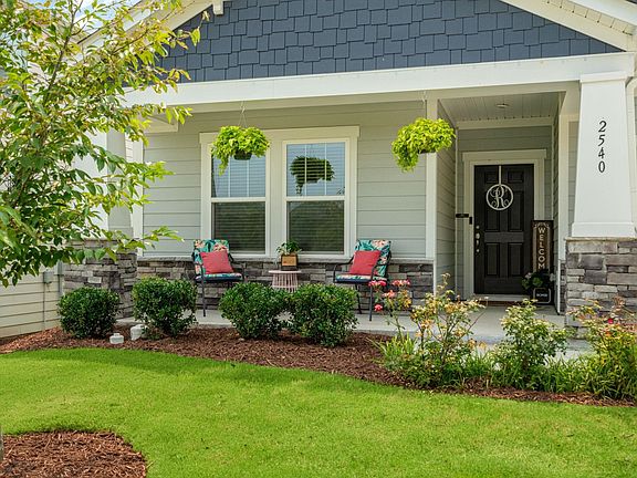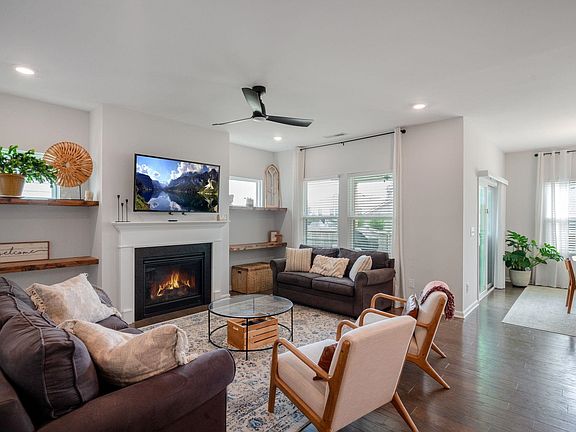 Enjoy the ease of one level living in this beautiful ranch home. Inside is a highly desired open floor plan loaded with natural light. You will love the fabulous kitchen with granite countertops, tile backsplash, a gas range, SS appliances, a walk in pantry & a sunny dining room. Relax in the family room with a cozy fireplace & custom floating wood shelving. The generous sized primary bedroom flows into the bath with a ceramic tile shower, dual vanity sinks and a large walk in closet. This desirable split floor plan has the primary bedroom in the back and the two additional bedrooms are in the front. Bonus areas are the custom built drop zone & a walk in, spacious laundry room! Sip tea on the covered front or back porches or enjoy the private fenced in yard. A perfect location in the neighborhood, on a cul de sac and across from the community pool, pickle ball court, playground, mailboxes and quick access to the greenways. Low maintenance living with an HOA that cuts & edges the grass & maintains the lawn care. New Hill is a growing town with a rural, peaceful feel but minutes away from highways and amenities.