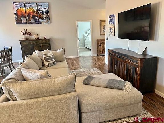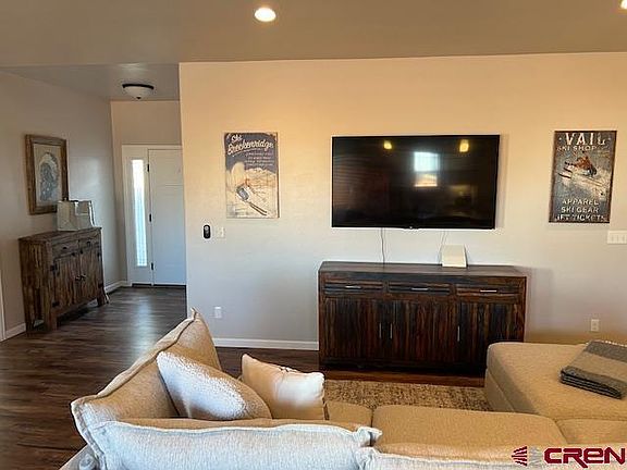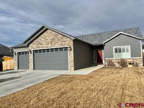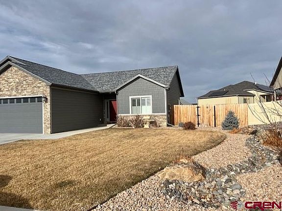 Beautiful newer ranch style home with an open concept kitchen, dining and living room with vaulted ceiling, great for entertaining. The kitchen features a large island bar, granite countertops throughout, under cabinet lighting, tiled backsplash, upgraded soft-close drawers with lots of cabinet space, and nice sized pantry. There are stainless steel appliances including a gas stove. You'll love the laminate flooring in the living, dining, kitchen, entryway, and hallway with tiled bathrooms, laundry room and carpeted bedrooms. Elevate high speed internet is already in. There is a spacious primary bedroom with walk-in closet, ensuite spa-like bathroom with separate tub and tiled shower with sliding door. On the other side of home you will see two good sized guest bedrooms and a full tiled bath with a sliding glass door. The ceilings are 9 foot with ceiling fans and vaulted ceilings in living room, desirable pull-out plantation shutters throughout home. The huge laundry room boasts of more storage cabinetry, granite countertops, and including washer and dryer. You will really like the large 3-car attached garage with more shelving storage. The heating is forced air furnace with upgraded tankless water heater, and a central A/C. Professionally landscaped with sprinkler system, and plenty of room for your RV or toys. Enjoy the privacy fenced back yard oasis with covered patio and a beautiful brick patio for all your entertaining needs. Large double gate and walk-in gate featured with the privacy fence. There are many walking paths and bike trails, you're close to the hospital, Pavilion, and Montrose's retail and restaurant sectors.