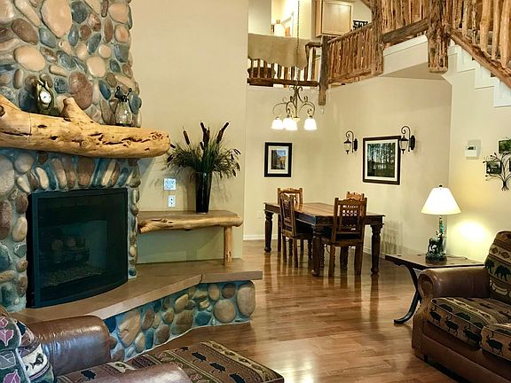 If you've been patiently watching for a move-in ready home, your wait is over! Instantly,the rustic charm and tall pine trees grab ahold of you. Walk inside and be greeted by the floor to vaulted ceiling fireplace and log railing throughout. Plenty of space to cozy up to a fire or retreat to the large loft to hang with the family/friends. Chefs of all levels will appreciate the beautiful kitchen with stainless steel appliances, plenty of prep space, storage, & dining space. If a downstairs bedroom is a must, then you'll be pleasantly surprised to find a master plus 2 additional bedrooms downstairs, plus another master upstairs. Both bathrooms downstairs feature dual vanities & a walk-in shower. Both masters have soaking tubs. A full-size laundry room is conveniently located off the