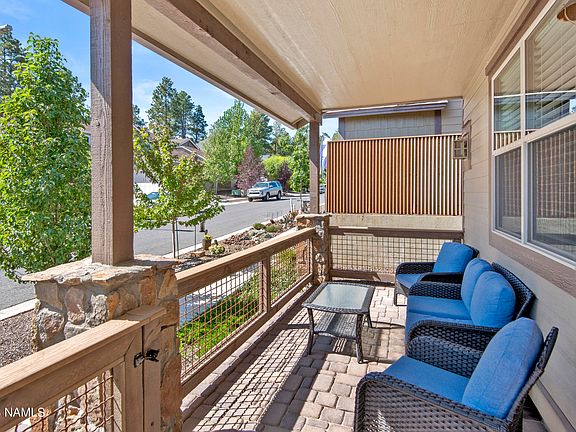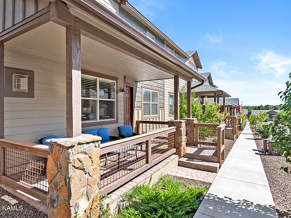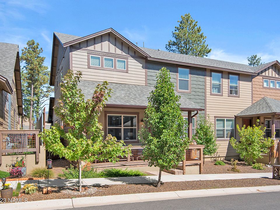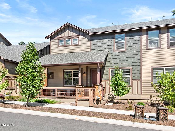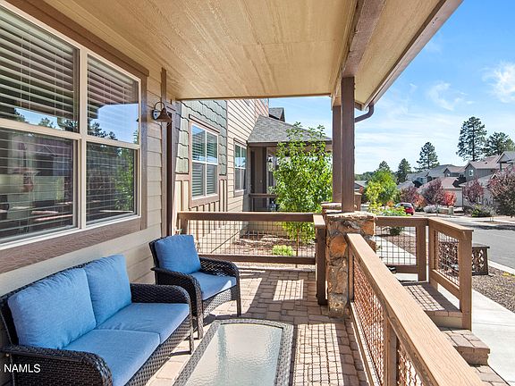 Impeccable home is like NEW! Alpenglow of the SF Peaks from your roomy Primary w large walk-in closet. Master bath w tiled walk-in shower, linen closet & double sinks. Grand front porch & fully pavered back yard w rustic privacy fencing. Ponderosa garden backs the home adding to your seclusion as you BBQ or relax in your bubbling hot tub. Enjoy friends & family in the glow of the stacked-stone fireplace. Chill in your quiet downstairs den w custom barn door. Spacious kitchen w beautiful backsplash & cupboard sliders make for easy organizing. Large 2nd & 3rd bedrooms w walk-in closets. Loaded w upgrades including wood vinyl, mudroom, granite, 42'' cabinets, GE Profile appliances, designer fans & lighting. Golf, hiking, Mt. biking & downtown only minutes away. VRBO okay