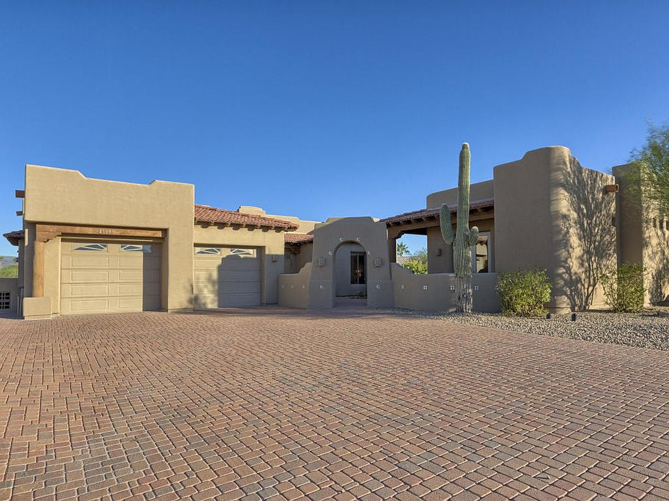 A rare find in Rio Verde. Style and design you would expect in Scottsdale. Built in 2008 with beautiful tumbled stone floors throughout. The gathering room is incomparable both in design and function--an entertainer's dream room. Twelve foot ceilings. Beautiful kitchen with tons of cabinets, a walk-in pantry and breakfast room options. Elegant Master Suite with a huge bathroom....beautiful granite his and her vanities and GlasBloc snail shower. Two other bedrooms or office with connected full bath. PLUS, a large private Casita suite that's perfect for your guests. Large wrap around patio has custom grilling area and wide angle views of the mountains. This is the one and its in the BEST active adult community in Arizona with two Tom Lehman designed golf courses and a whole lot more.