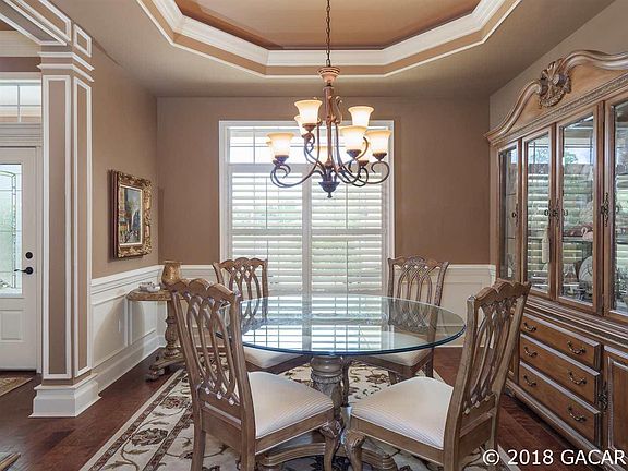 Elegant Home built in 2014, feels like new, in Haile Plantation, Market Square - a Golf Cart Community. 3 Bedrooms, 2 Baths, split plan. Bright and gorgeous with high ceilings, hand scraped hard wood floors, trimmed out for a truly finished feel AND Plantation Shutters in every room! Dream kitchen with lots of 42" cabinets and granite counter top for max working space, breakfast bar and breakfast nook plus Skylight. Formal dining room with trey ceilings and molding, Fireplace in great room, French doors to Screened in Lanai with view to Nature. Owners suite with Luxury Bath, 2 separate sinks with Granite counter tops and spacious walk in closet. Built solid too: R-30 cocoon insulation, HVAC seer 15, Tankless water heater, Low E windows, irrigation system with reclaimed water, 30 yr shingles and Extra Large 2 car garage 524 sq. ft. Walk to Publix, restaurants, shops and bank, enjoy Farmers market at Village center and miles of trails for biking/walking/jobbing. Close to UF/Shands/VA, Santa Fe College, NFRMC, I-75 great schools, zoned for Chiles, Kanapaha and Buchholz. Call for your private tour.