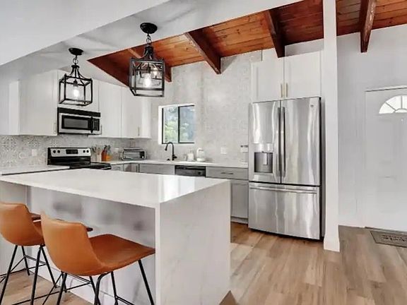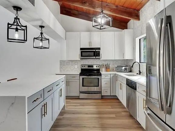 - Bedroom on Main Level, Eat-in Kitchen, Kitchen Island, Living/Dining Room, Multiple Primary Suites, Vaulted Ceiling(s)