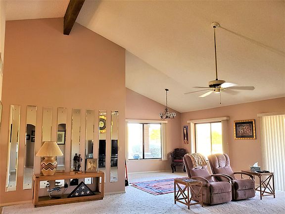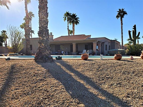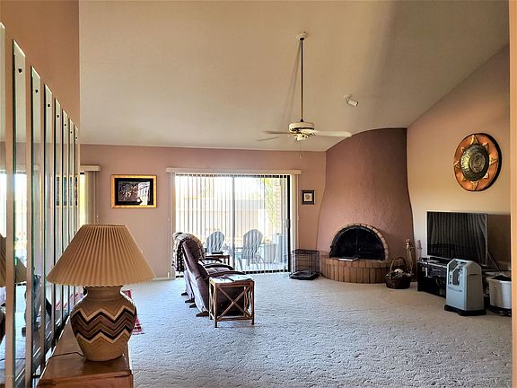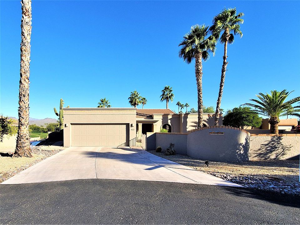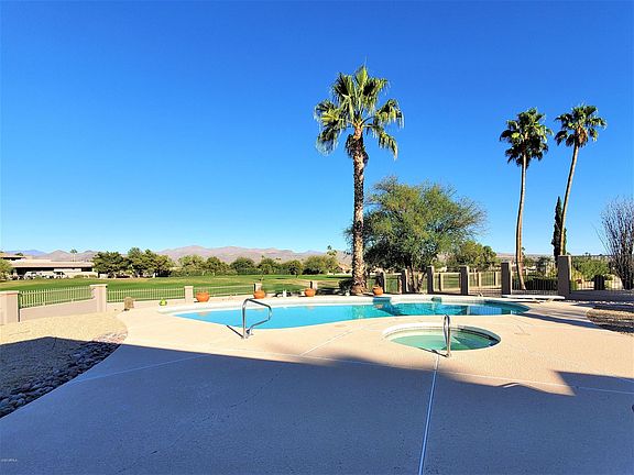 Excellent opportunity to have a single family POOL home on a slightly elevated large lot, overlooking the golf course and capturing the lovely mountain views for $510,000. The home has a Great Room with corner fireplace & vaulted ceilings, 2 bedrooms, plus 3rd bedroom/office. Rare 2 1/2 bathrooms. Located on a quiet cul-de-sac, the lot is 16,534 square feet supplying room for expansion of the home or add a casita. The positioning of the home works well for Winter & Summer weather conditions. Large front courtyard and covered rear patio overlooking the pool & spa. This price allows a new owner to update & customize the home.