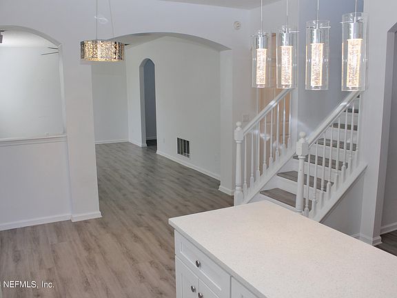 Renovations in 2022 include a gorgeous white kitchen, luxurious master bathroom, new vinyl plank flooring downstairs, new carpet upstairs and the additional bathrooms have been updated. The entire inside of the home has just been re-painted, The home sits at the end of a cul-de-sac and the rear of the home faces south for preferred lighting. The covered patio overlooks a large, fenced back yard. Roof replaced 2019. New AC units 2023. The location is central to everything including the beaches, mayo clinic & St. Johns Town Center. No CDD fees.