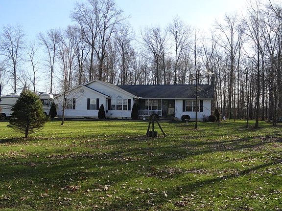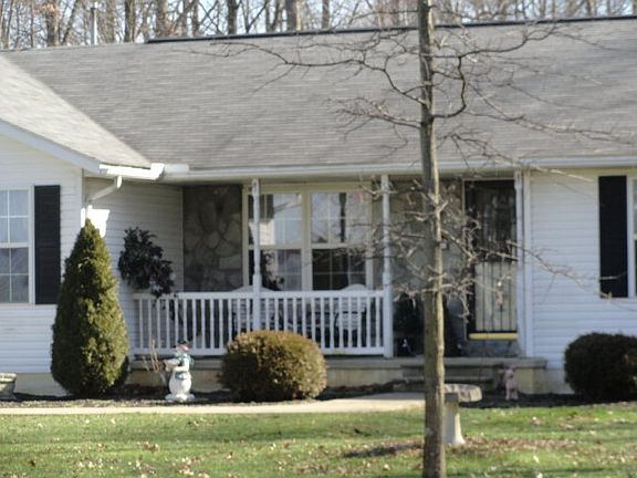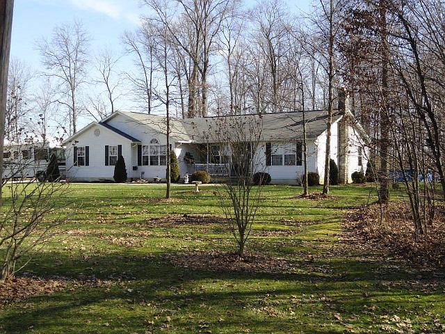Sprawling custom built ranch, offering covered front porch, great room with cathedral ceilings and atrium doors that lead to concrete patio. 4 acres of wooded serenity. Spacious private master suite. Large kitchen with tons of cabinets, dining area and breakfast bar. 1st floor laundry. Oversized 2 car attached garage. Partially finished basement with wood burning Lily Stove. 24x38 heated, insulated garage with 8x38 canopy and concrete patio. Great for entertaining!