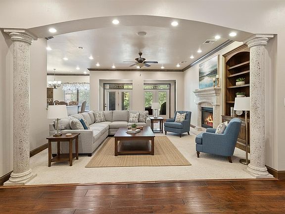 The spacious living room features a cast-stone fireplace and double French doors leading to the patio with a cozy outdoor fireplace. A private study with a wall of built-in bookcases makes the perfect home office. The open kitchen is complete with a two-tier island, breakfast bar, ceiling-height cabinets, 3CM granite counters with travertine backsplash, pull-out drawers and spice racks, two large storage pantries, and newer appliances (all 2–3 years old with exception of the dishwasher that was just replaced in July 2025).