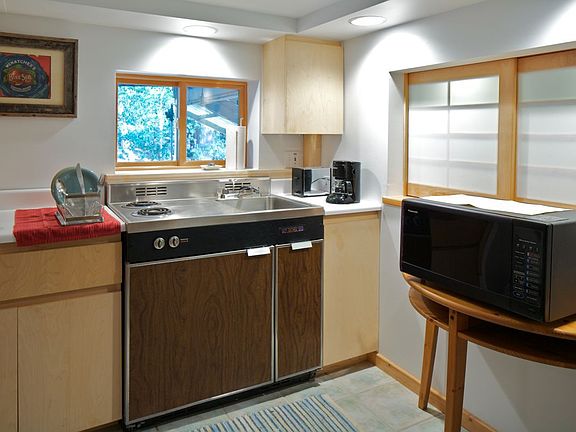 Set in a park like setting on over an acre this small apartment is sized for 1-2 people max. Very charming japanese styling with built in bed and other features. Large boulder in the main room and leaded glass give this space tons if character. The apartment is below the main house with one off street parking spot or plenty of on street parking. Rent includes utilities, TV and internet. Call for more info 949-243-2634