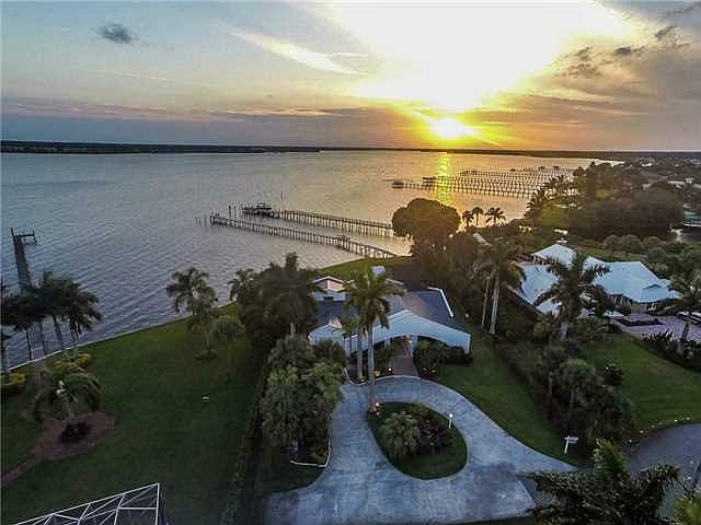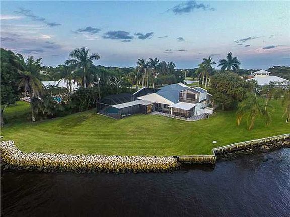 From the moment you enter this contemporary masterpiece, you can feel the calming power of the water nearby. Perfectly situated at the very end of Britt Road on a half acre of prime deep waterfrontage on the North Fork of the St. Lucie. The split plan home features an updated kitchen with stainless appliances, large family/media room, loft office space, abundant storage, and study areas. Luxurious water views from the dining and living rooms. Outside, drink in over 120 ft. of waterfrontage, lounge by the pool, and enjoy breathtaking, colorsplashed sunsets at the end of the dock. Not your average cookie-cutter box, only for those with an appreciation for the sublimely unique.