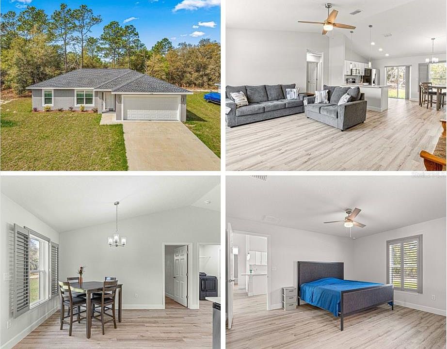 Don't wait to build—this home is better than brand new! Step inside this stunning MOVE-IN READY 2023 masterpiece to be greeted by vaulted ceilings, LVP throughout, split floor plan and insulating custom shutters/ blinds that helps reduce your energy bills plus blocks the sun's harmful UV rays. Open-concept design seamlessly connects the living room, dining area plus kitchen creating an inviting space for family and friends. Indulge your culinary desires in this kitchen that offers modern Stainless Steel appliances, Soft-close cabinets, Quartz Countertops, and ample cabinet space. Retreat to the spacious master bedroom boasting a spacious walk-in closet, with an ensuite bathroom for your own private oasis equipped with quartz countertops & tile walk-in shower. Two additional bedrooms offer versatility for guests or a home office with a conveniently located guest bathroom. Generous 2-car garage provides plenty of storage and parking space. Prepare to be impressed by the thoughtful details throughout, including dual-flush water sense/efficiency toilets, a lighted doorbell button, and tilt windows for easy cleaning. Plus, enjoy the peace of mind provided by the new 2023 Rain Soft whole-house water treatment filtration/water purification system. Nestled in a quiet and friendly neighborhood close to stores, schools, and Rainbow State park. For all the horse lovers out there, the World Equestrian Center is just 8.1 miles away & HITS a mere 13 miles. A transferable Builder Home Buyers Warranty ensures worry-free ownership, while the absence of HOA fees offers freedom and flexibility. As an added bonus this home is being sold furnished including a sofa, loveseat, dining room table set, push mower, king bed, and GE washer/dryer that were all purchased in 2023. Don't let this incredible opportunity slip away, make this gorgeous house your forever home and start living your happiest life today!