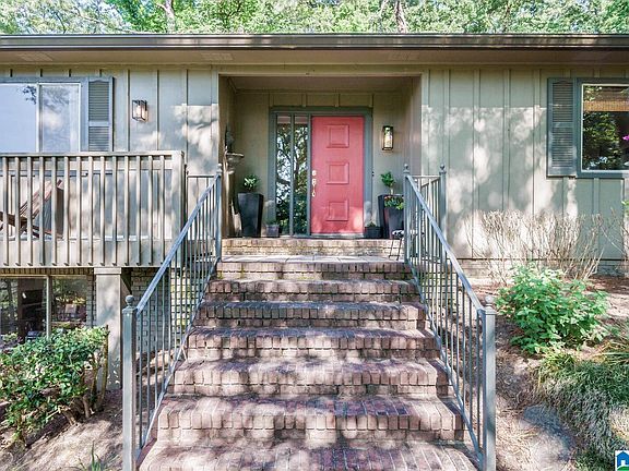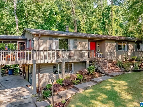 Enjoy a mid century mountain chalet feel in this beautiful Vestavia home, surrounded by lush trees and plenty of privacy. This sun-filled home boasts exposed brick, cathedral ceilings adorned with gorgeous beams, hardwood flooring, and a kitchen equipped with stainless steel appliances and tiled floors. You'll discover many unexpected features inside this stunning home.. All bedrooms and baths are conveniently located on the main level, while the finished basement provides versatile space for entertaining, playroom, office or even a home gym. The wraparound and screened decks are great for savoring your morning coffee or hosting friends and family. Zoned for Vestavia's award winning schools.