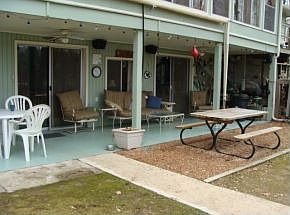 Just in time for Summer!! Very gentle walk down water front home on the main channel. Enjoy the unobstructed mowed to the water view of the lake from the patio, deck, sunroom and family room. Patio ready for summer barbeques and family gatherings. Cozy family room with fireplace. 768 sq feet extra living space in separate guest quarters with 3/4 bath over 2 car detached garage. RV parking with dump station. 10 x 24 boat slip with 12,000 lb lift and locker included only a short golf cart ride away.
