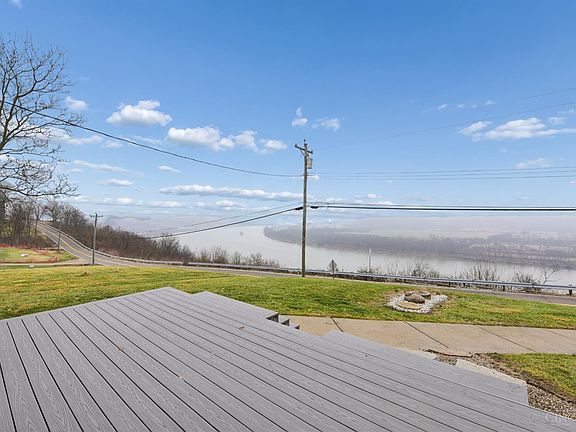 STUNNING panoramic 14-mile Ohio River view & the rolling hills of KY. All new windows and doors fill the home with natural light and allow you to enjoy the breathtaking scenery from every angle - even while cooking in the custom gourmet kitchen featuring Calcutta granite countertops, large center island with range/oven, soft-close cabinetry, custom marble backsplash and new stainless appliances. The open floor plan is perfect for both entertaining & everyday living, highlighted by a fully operational fireplace and beautiful craftmanship throughout. A 3-season glass solarium and outdoor patio offer a 180-degree river view. The first-floor primary suite provides comfort and convenience with an over-sized shower, double vanity & main floor laundry. The 2nd floor includes potential in-law suite/Airbnb with private entrance and walk-in closet. A custom entertainment center w/wet bar sits beneath a soaring 18-ft cathedral ceiling and windows with a river view. Completely move-in ready!!