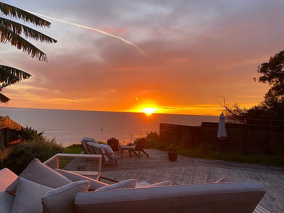 Oceanfront private home. Quiet and amazing. Huge ocean deck and hot tub. Fruit trees, furnished or unfurnished. Has all the comforts and includes gardener. Two master suites, 3Br/3Ba. Views of Islands all the way to UCSB. Steps to beach and the Douglass preserve. Includes garden service and utilities but not water bill. Pets require additional security deposit. No smoking in the house. Lease term may be negotiable. No subleasing allowed
