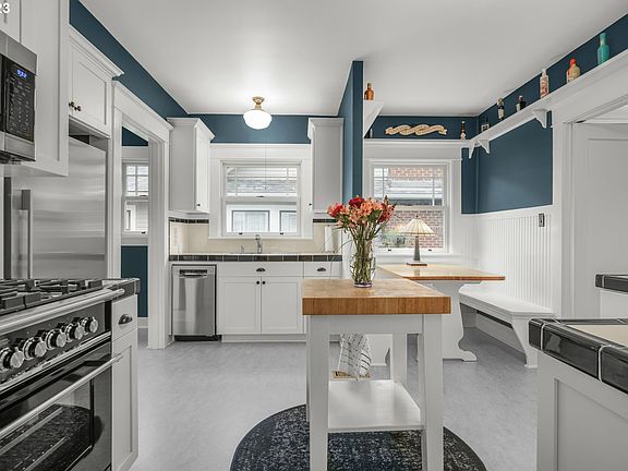 Welcome to this timeless gem nestled in the heart of the highly desirable Irvington neighborhood. This adorable classic Bungalow blends historic charm with modern comfort. Natural light floods the home, highlighting the lovely original built-ins, crown moulding and wainscoting. On colder nights, enjoy the gas fireplace in the cozy living room. Rejuvenation ceiling fans and light fixtures add to the charm. Its layout, with 2 bedrooms and a bath on the main floor, one bedroom and bath on the second floor, and a 4th bedroom with full bath and additional living area in the finished basement make it ideal for a growing family or two professionals needing private spaces for virtual work. The bedrooms on the main and upper floors have California closets with built-ins and the upstairs suite has a mini split for auxiliary heat and A/C. The heart of the home is the updated kitchen. Recently refreshed, the kitchen comes complete with top-of-the-line appliances, including Fisher and Paykel oven and refrigerator, Bosch dishwasher, soft-close cabinet doors and drawers. The seating nook is ideal for casual meals or morning coffee. The large finished basement and full bath is perfect for a media or music room, extra guest room, gym, office or carpeted playroom. Step outside to discover a charming, fully fenced backyard. Whether you are entertaining friends or enjoying a quiet evening, the patio provides the ideal setting for an alfresco dining and relaxation. There are double hung, double pane Renewal By Anderson windows with screens. This property puts you within walking distance of renowned schools, several grocery stores, cafes, shops, and restaurants. Come experience the ultimate in urban living. [Home Energy Score = 5. HES Report at https://rpt.greenbuildingregistry.com/hes/OR10221709]