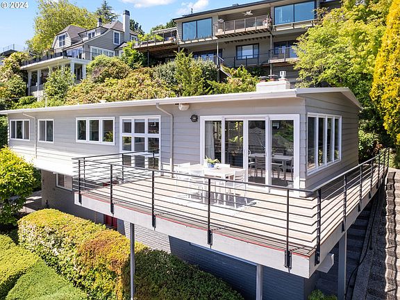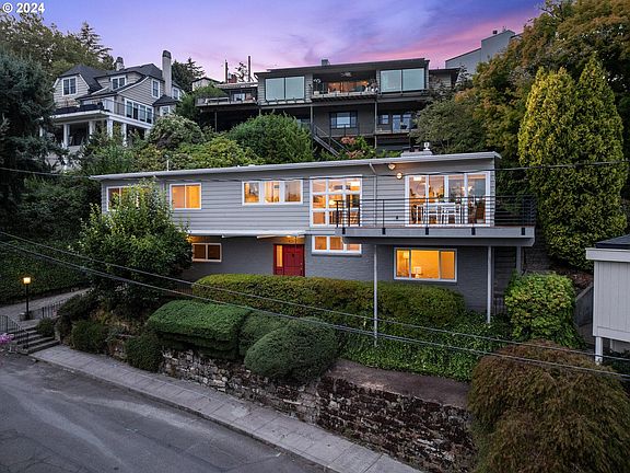 Looking for a Penthouse alternative with no HOA fees, rules or shared walls? Consider this easy care view home with iconic Mt. Hood and cityscape as a constant presence. Built in 1959 & located in the established Kings Heights neighborhood, this sophisticated residence was designed for entertaining friends with a Pacific NW flair. A Sunset Magazine ambiance emanates from this contemporary two-level that has a pristine "Mamie Eisenhower" original pink tile bath. A 2nd bath features original peach & aqua tile. This was the year the first Barbie doll was issued, the movie Gigi swept the Academy Awards and both Ella Fitzgerald & Elvis Presley were playing on the radio. Honoring the retro features, a permitted remodel was done in 2011 resulting in a dramatic Great Room and opened up sight lines creating natural flow & airy feel that captures the south light and views of both cityscape and Mt. Hood. Oak floors, a gas fireplace with Carrara marble surround, custom built-in cabinets, a to-the-studs high end kitchen, and an expanded mahogany deck were thoughtful modern updates. The kitchen has a generous-sized carrara marble island with wet bar, 6 burner Kenmore Pro gas range, SubZero refrigerator, Sharp microwave drawer & Miele dishwasher. You even see Mt. Hood while doing dishes! The lower level floor plan is versatile with original green-grey slate floor entry, an open wood staircase and a large bedroom suite w/ updated full bath. This bedroom could be also used as family room or office. A back patio is covered and provides a handy spot for the grill and quiet shaded garden. Details include wrought iron railings, updated light fixtures, sliding doors & a 2 level stairwell with windows. Attached 2 car garage with a 16 x 12 storage room for workbench, exercise or hobbies. AC for hot summer days. Close proximity to downtown, hiking trails, parks and dining. Pittock Mansion, Hillside Center, Forest Park NW 23rd Ave & Uptown Shopping. [Home Energy Score = 3. HES Report at https://rpt.greenbuildingregistry.com/hes/OR10226499]